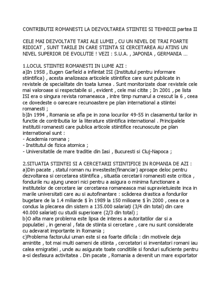 Contributii Romanesti La Dezvoltarea Stiintei Si Tehnicii