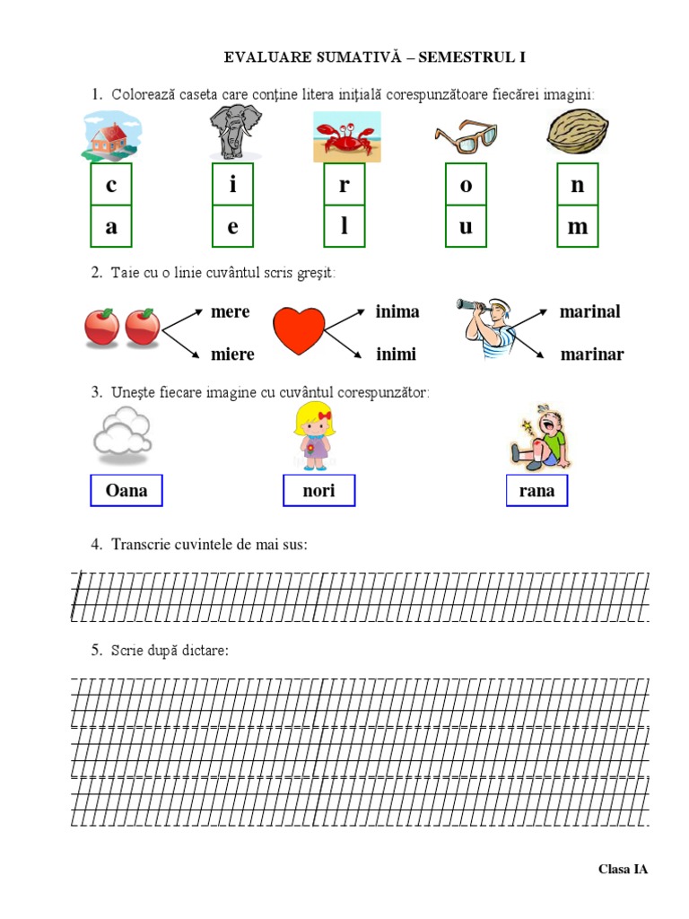Evaluare Sumativa Rom Sem I Cls I Varianta 2 Matrice Bareme