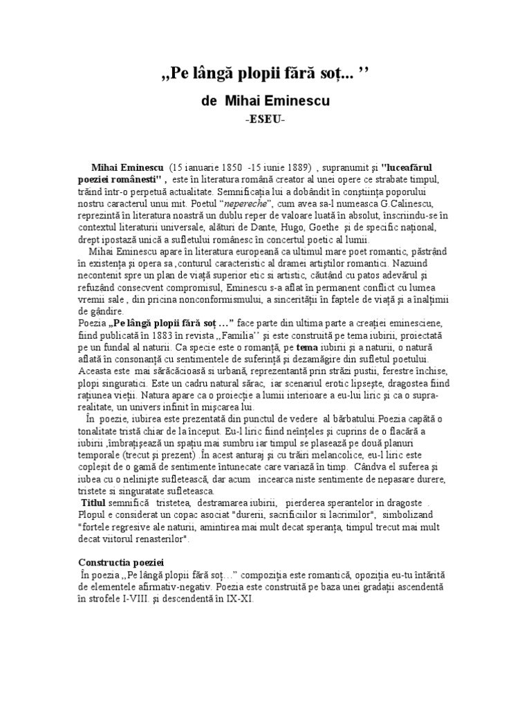 Mihai Eminescu Pe Langa Plopii Fara Sot