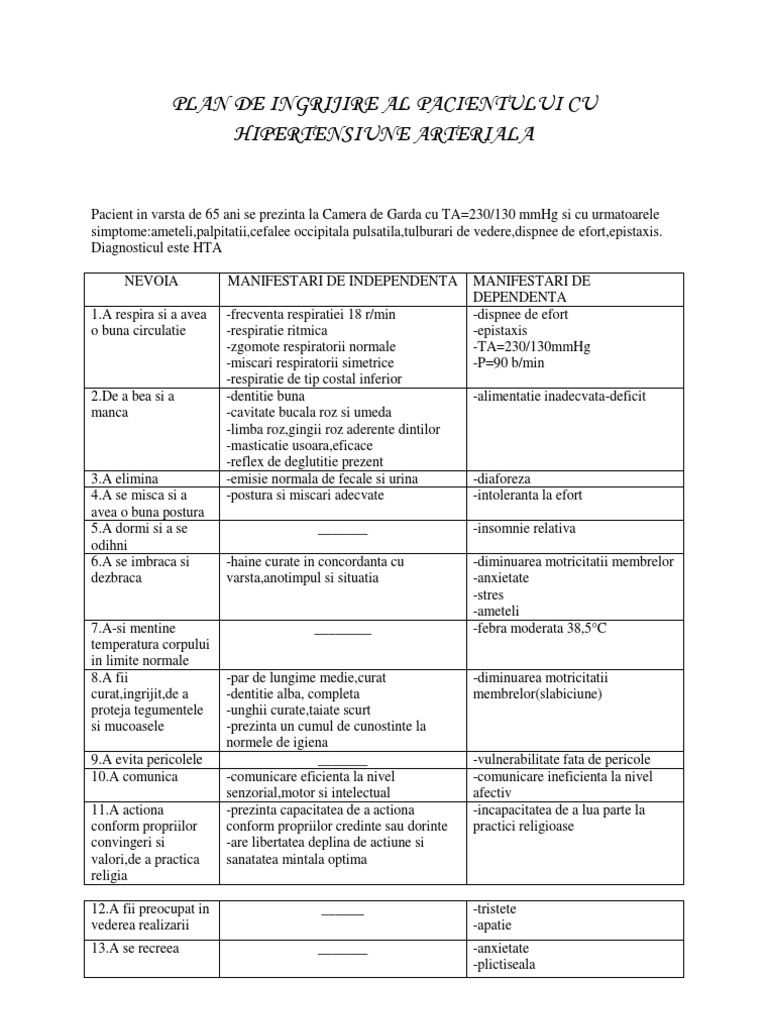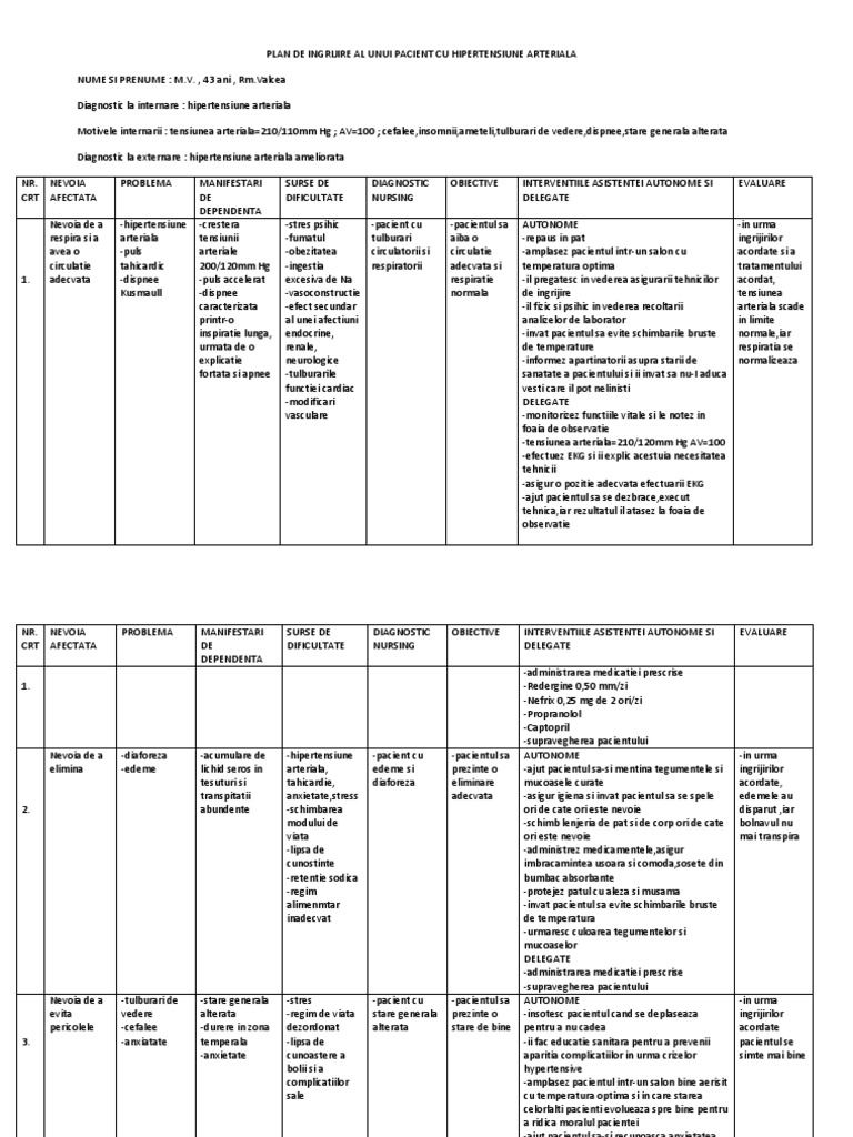 Plan De Ingrijire Al Pacientului Cu Hipertensiune Arteriala