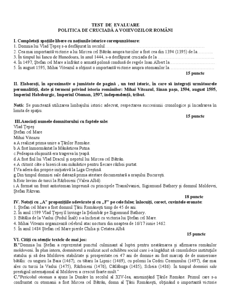 Test De Evaluare Politica De Cruciadă A Voievozilor Romani