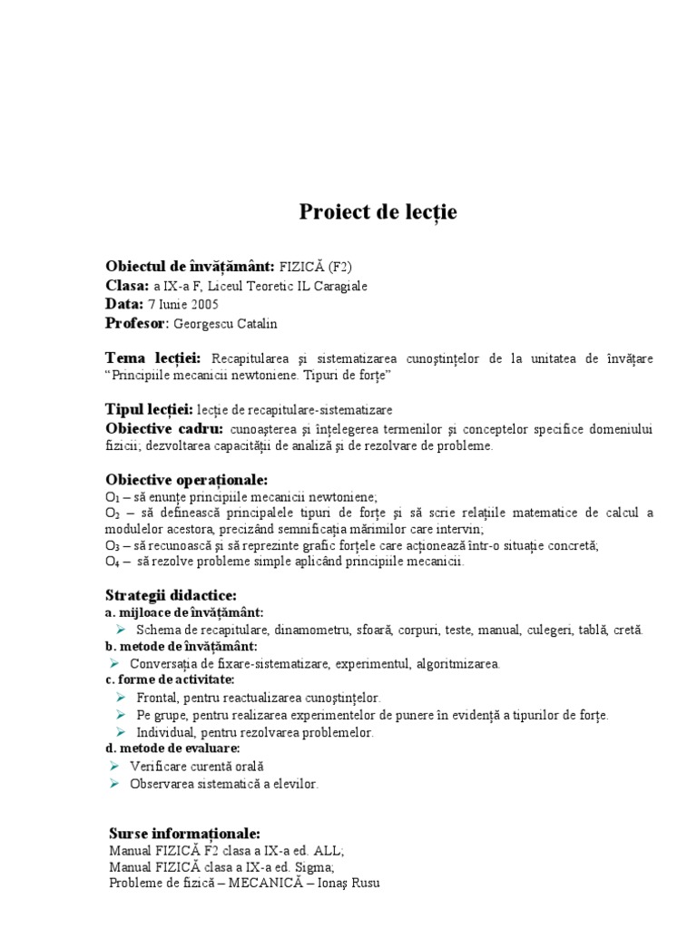 Seminar Plan De Lectie Principiile Mecanicii Newtoniene Fizica 4388