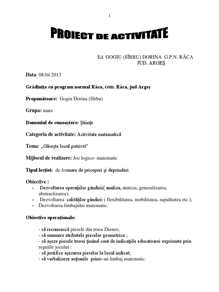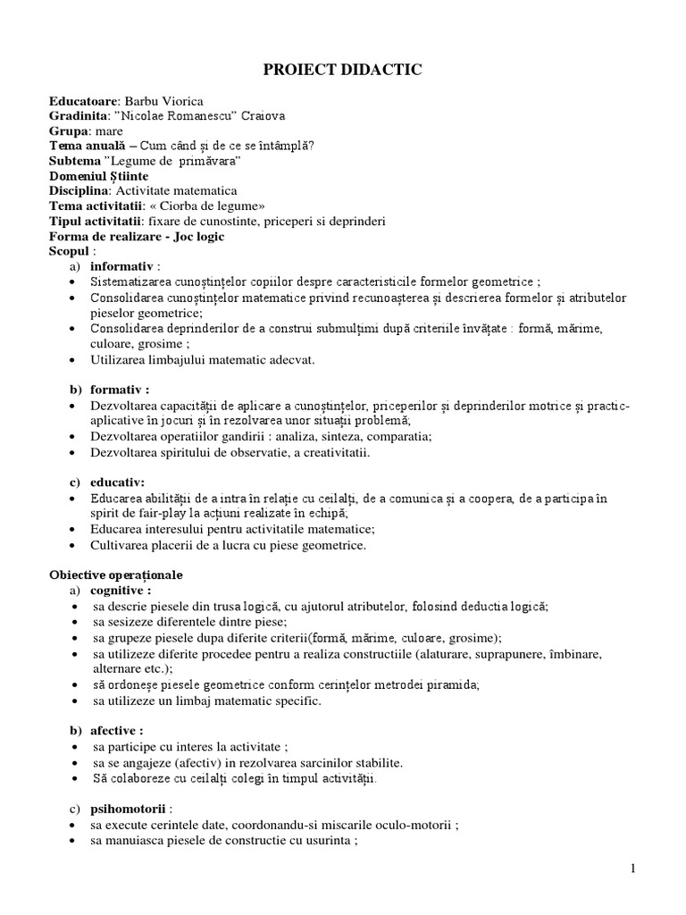 Doc Proiect Activitate Matematica Gabriela Alexandra Academia Edu