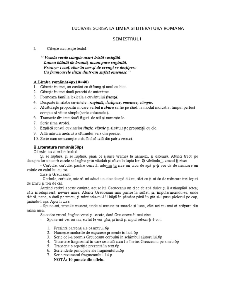 Doc Lucrare Scrisă La Limba Si Literatura Romană Semestrul I Clasa A Vii A I Raileanu Diana Academia Edu