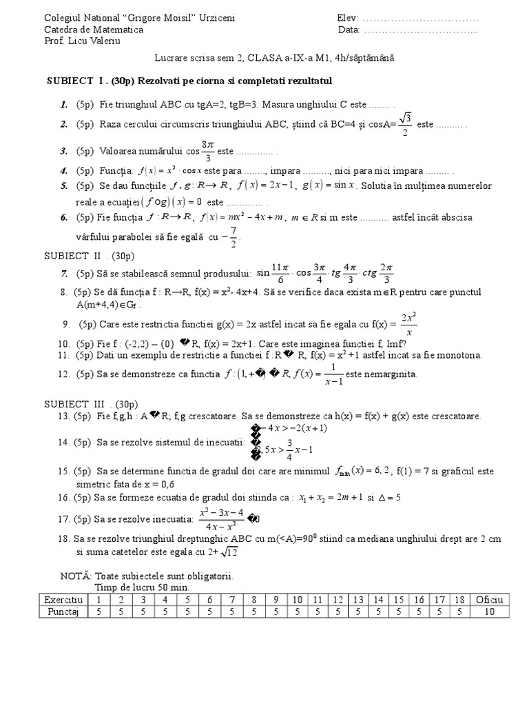 Modele De Teză La Matematică Sem 1 Liceu Clasele 9 12 An școlar 2018 2019 Jitaruionelblog Pregatire Bac Si Evaluarea Nationala 2020 La Matematica Si Alte Materii Materiale Lectii Formule Exercitii Rezolvate Matematica